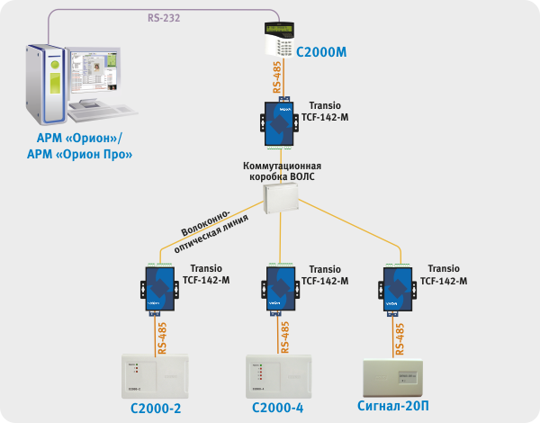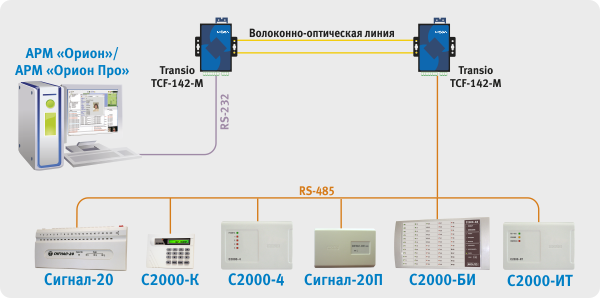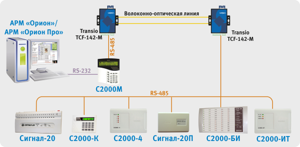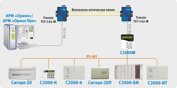 1. Сетевой контроллер АРМ «Орион»/АРМ «Орион Про» подключается к модему ВОЛС через RS-232, далее оптическая линия связи, потом модем ВОЛС на выходе также RS-232 далее пульт C2000М, на выходе RS-485 далее приборы.