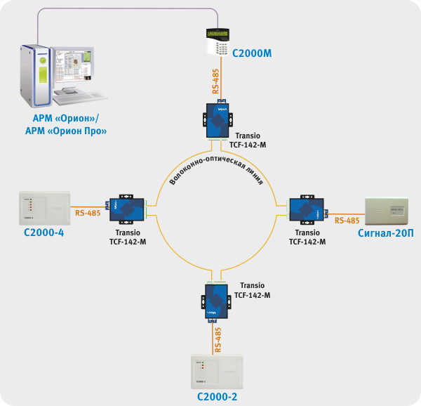 4. Сетевой контроллер АРМ «Орион»/АРМ «Орион Про» подключается к пульту C2000М, далее модем ВОЛС через RS-485, далее кольцевая оптическая линия связи, потом модемы ВОЛС на выходе также RS-485 далее приборы.