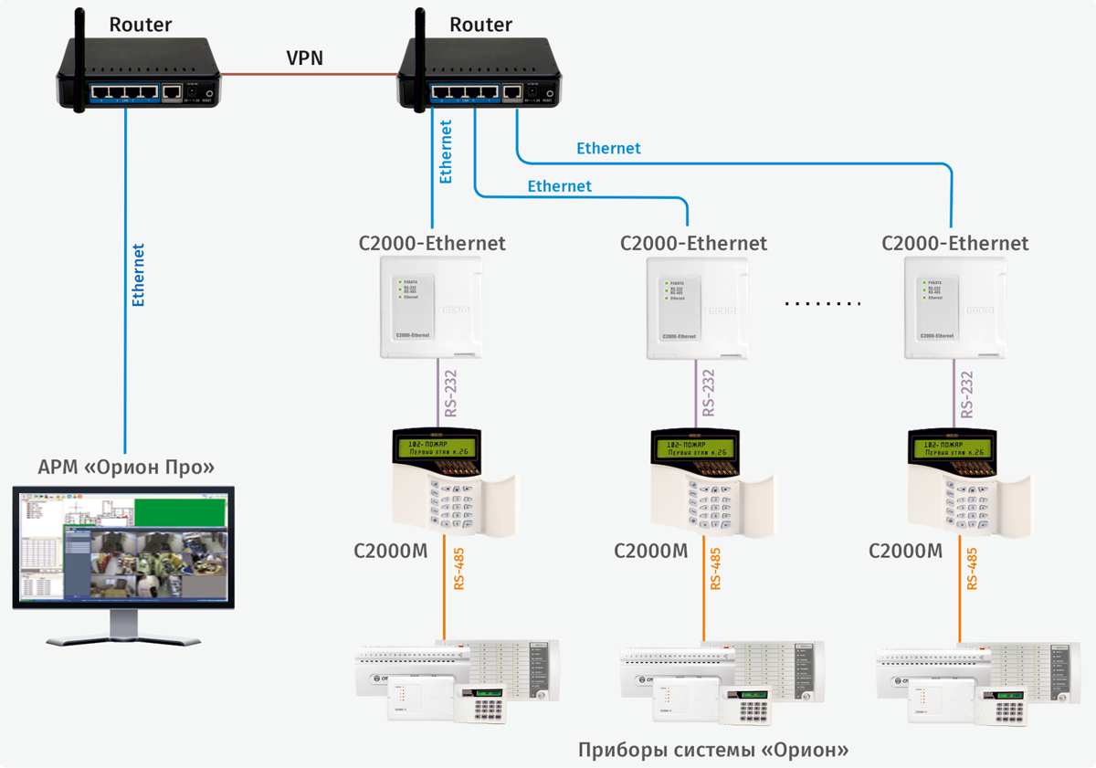 Также при использовании «С2000-Ethernet» возможно объединение приборов ИСО «Орион» через глобальную сеть Internet, используя VPN-туннель (см. рис.).