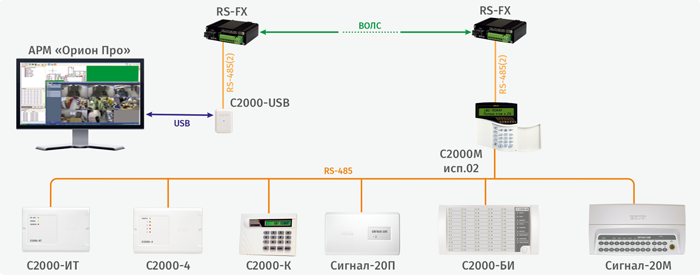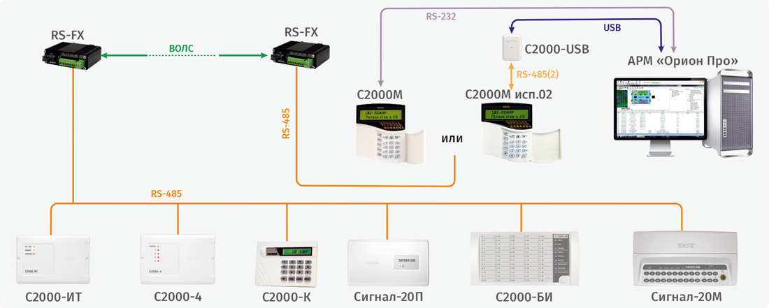 Структурная схема использования преоразователей RS-FX с АРМ «Орион Про» и «С2000М»/ «С2000М исп.02»