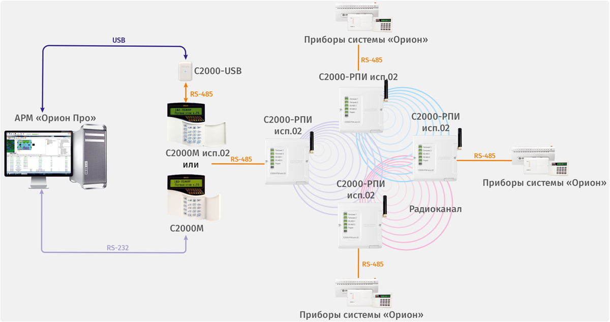 Также один «С2000-РПИ исп.02», находящийся на стороне пульта может получать данные от 32 удаленных «С2000-РПИ исп.02» с подключенными к ним блоками ИСО «Орион».