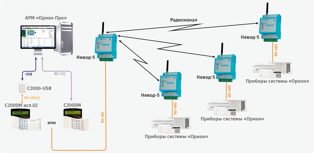 Как и в случае с «С2000М», к компьютеру с АРМ «Орион Про» может потребоваться подключить несколько пультов. Это возможно следующими способами: