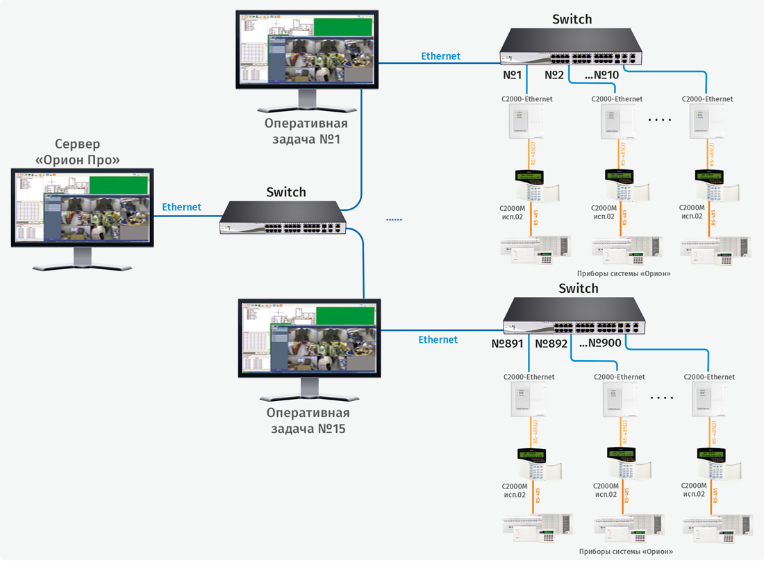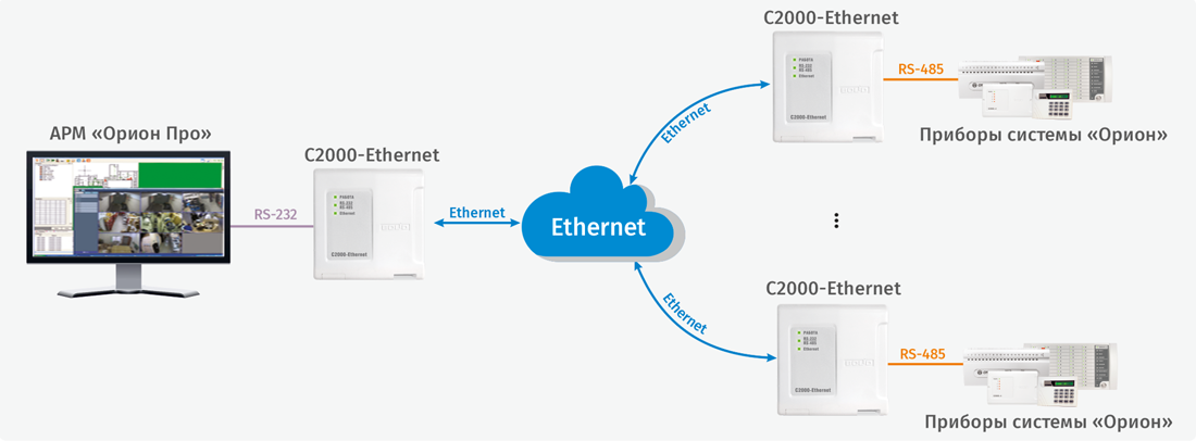 Для охранных систем и систем контроля доступа возможно построение схем без пульта «С2000М»/«С2000М исп.02», при этом «C2000-Ethernet», помимо передачи интерфейса, осуществляют преобразование интерфейса RS-232 в RS-485.