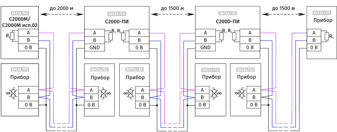 Например, преобразователь-повторитель интерфейсов с гальванической изоляцией «С2000-ПИ» позволяет увеличить длину линии максимум на 1500 м, обеспечивает гальваническую изоляцию между сегментами линии и автоматически отключает короткозамкнутые сегменты интерфейса RS-485. Каждый изолированный сегмент линии RS-485 должен быть согласован с двух сторон - в начале и конце. Следует обратить внимание на включение согласующих резисторов в каждом сегменте линии RS-485: они должны быть включены переключателями в повторителях «С2000-ПИ», а не перемычками в приборах, поскольку переключатели не только подключают согласующее сопротивление, но также выдают в линию RS-485 напряжение смещения, которое необходимо для правильной работы этих повторителей.