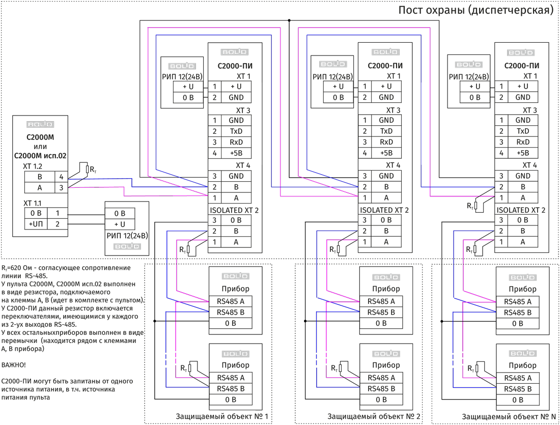 Для согласования используются резисторы сопротивлением 620 Ом, которые устанавливаются на первом и последнем приборах в линии. Большинство приборов имеет встроенное согласующее сопротивление, которое может быть включено в линию установкой перемычки («джампера») на плате прибора. Поскольку в состоянии поставки перемычки установлены, их нужно снять на всех приборах, кроме первого и последнего в линии RS-485. В преобразователях-повторителях «С2000-ПИ» согласующее сопротивление для каждого (изолированного и неизолированного) выхода RS-485 включается переключателями. В приборах «С2000-К» и «С2000-КС» встроенное согласующее сопротивление и перемычка для его подключения отсутствуют. Если прибор такого типа является первым или последним в линии RS-485, необходимо установить между клеммами «А» и «В» резистор сопротивлением 620 Ом. Этот резистор входит в комплект поставки прибора. Пульт «С2000М»/«С2000М исп.02» может быть установлен в любом месте линии RS-485. Если он является первым или последним прибором в линии, между клеммами «А» и «В» устанавливается согласующий резистор 620 Ом (входит в комплект поставки).