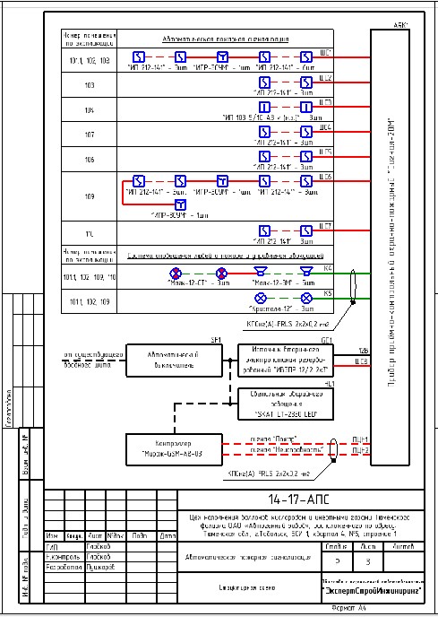 Автоматическая пожарная сигнализация в цехе наполнения смонтирована по проекту "14-17-АПС" на приборе приёмно-контрольный охранно-пожарный "Сигнал-20М". Учтены особенности объекта - эксплуатацию взрывопожароопасных производственных объектов. Система пожарная сигнализация формирует управляющие и информационные сигналы в систему вентиляции.