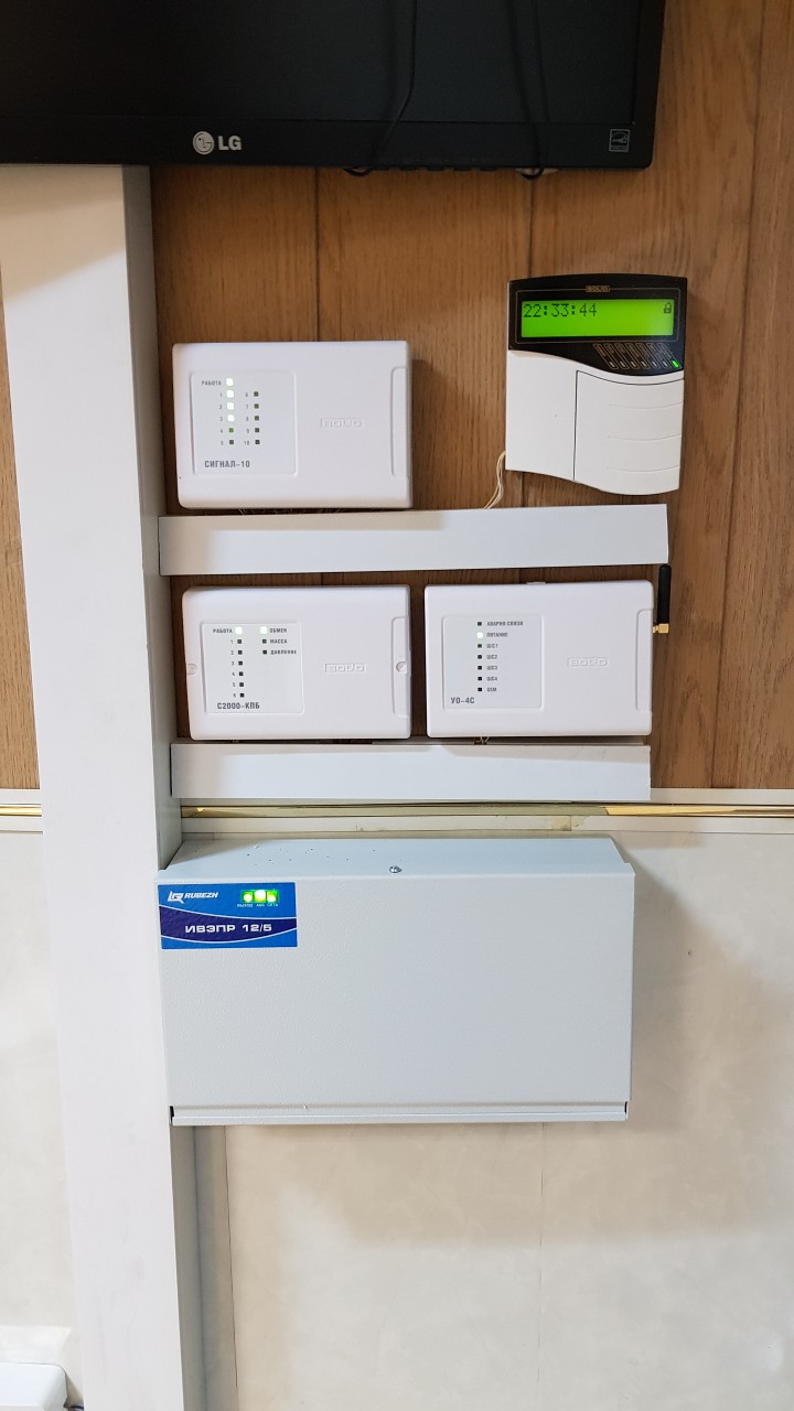 По желанию клиента была смонтирована система охранно-пожарной сигнализации с оповещением людей о пожаре. Система состояла из следующих приборов компании Болид: Сигнал-10, Контрольно-пусковой блок С2000-КПБ, GSM модуль УО-4С исп.02 а так же пульт контроля и управления С2000М. В качестве объемных датчиков СКУД были использованы Астра-516. В связи с частым задымлением помещения от работы спец. техники были применены тепловые извещятели компании НПКФ «Комплектстройсер-вис» ИП 103-5/2С-А1. В качестве ручных пожарных извещятелей были применены ИПР 513-3М в каждом боксе.