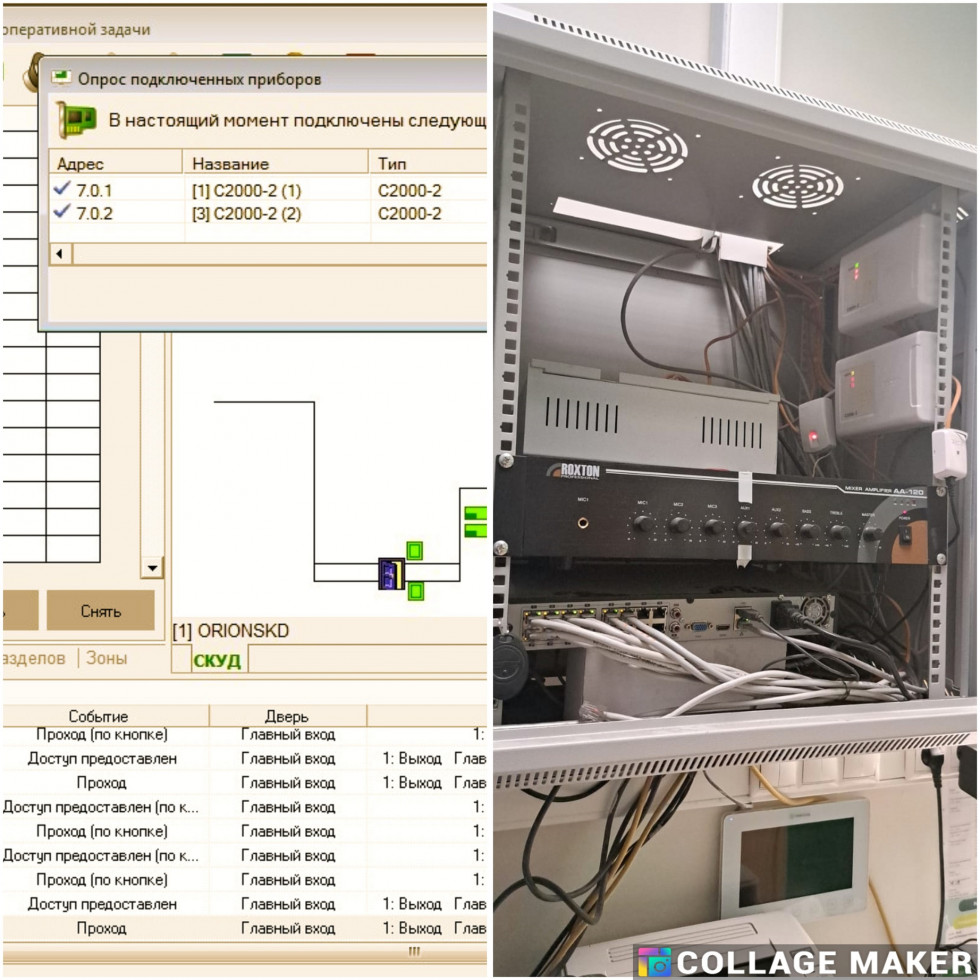 2 точки доступа для входа/выхода учеников контролирует прибор С2000-2 со считывателями С2000-Proxy Н. Данные о проходах передаются через преобразователь USB-RS-485 на сервер с установленным ПО АРМ Орион Про (программирование карт доступа, генерация отчетов) .