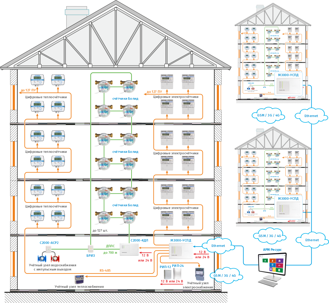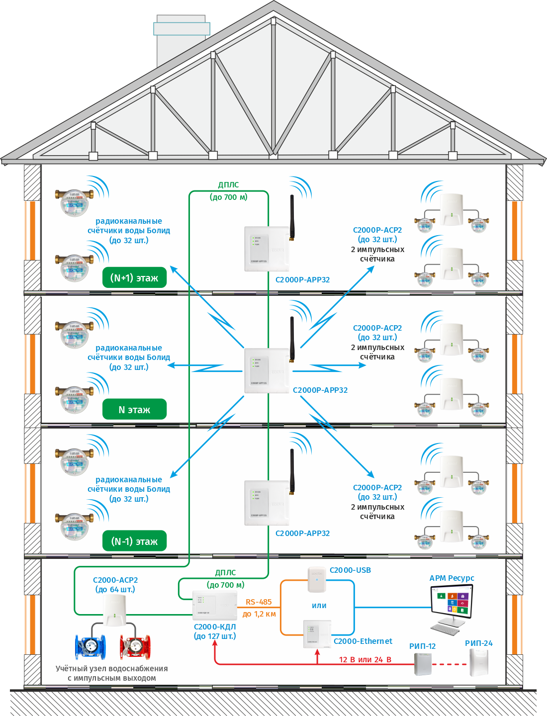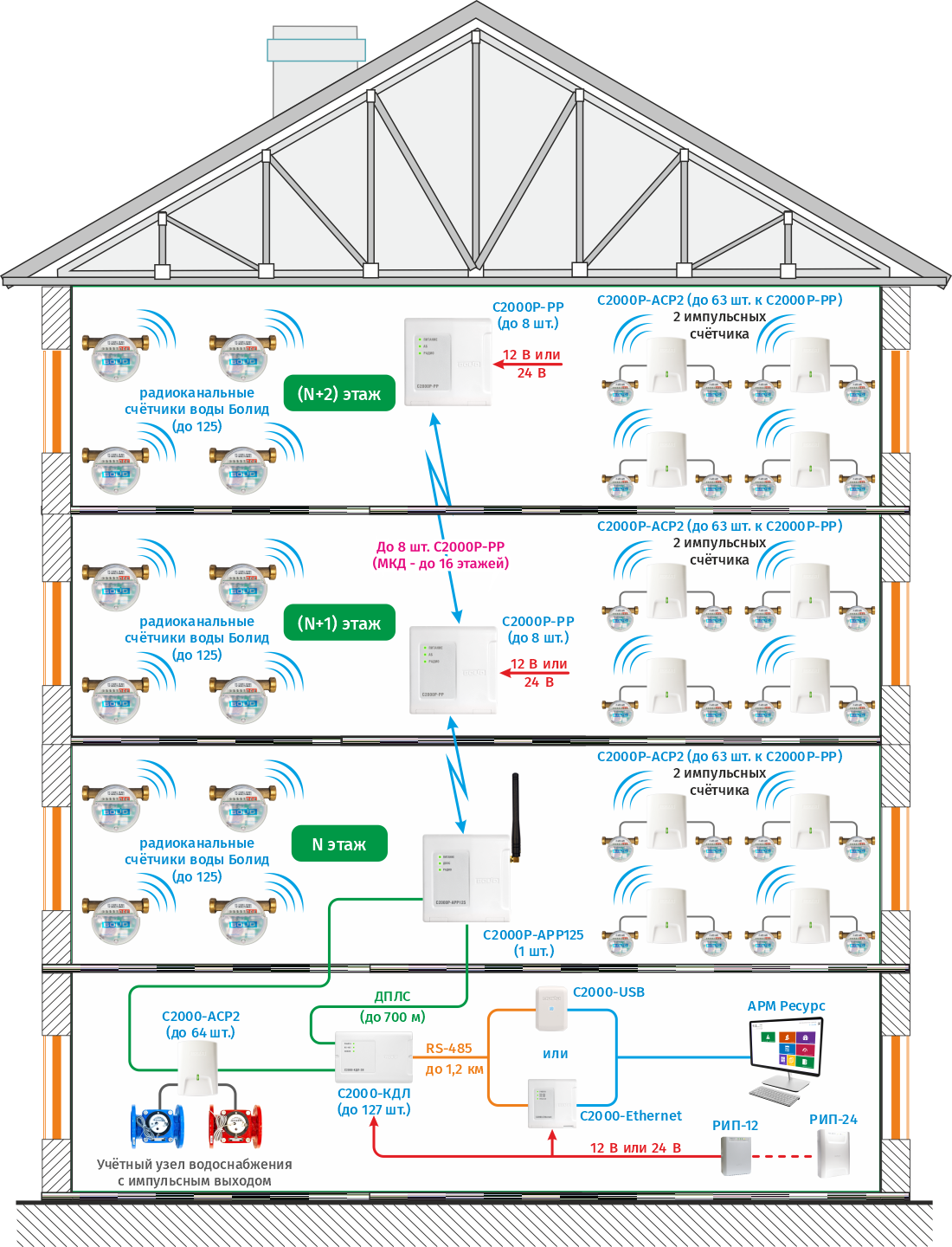 Сбор показаний с импульсных счётчиков по радиоканалу организуется с помощью беспроводных регистраторов импульсов С2000Р-АСР2, радиорасширителя нового поколения С2000Р-АРР125 и контроллера С2000-КДЛ. Радиоканальные счётчики воды СВК15-3-8-1-Б3 подключаются к С2000Р-АРР125 напрямую. Ретранслятор радиоканальный С2000Р-РР предназначен для увеличения радиуса действия С2000Р-АРР125. К одному радиорасширителю С2000Р-АРР125 возможно подключение до 8 штук ретрансляторов С2000Р-РР. В условиях МКД, после тестирования качества радиосвязи возможен охват одним С2000Р-АРР125 или С2000Р-РР трёх этажей в секции. Т. о. возможна установка ретрансляторов С2000Р-РР «через этаж» и охват одним С2000Р-АРР125 до 16 этажей в секции. Если качество радиосвязи не позволяет этого, то для обеспечения гарантировано хорошего соединения между С2000Р-АРР125 и радиоустройствами рекомендуется использовать С2000Р-АРР125 или С2000Р-РР на каждом этаже секции. Схема оптимальна при невозможности завести кабель в квартиры и протащить его по межэтажным стоякам и позволяет существенно снизить затраты на кабель и монтажные работы. Функционал и соединение С2000-КДЛ с АРМ «Ресурс» аналогично проводному решению.