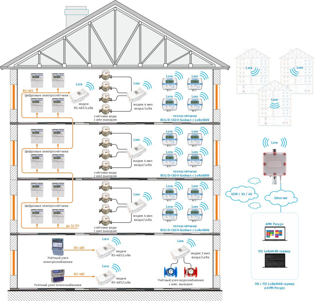 Передача показаний приборов учета в сети стандарта LoRaWAN осуществляется посредством широкополосного радиосигнала с линейной частотной модуляцией на диапазоне частот 864-869 МГц. Данные со счетчика со встроенным или внешним LoRaWAN-модемом передаются на базовую станцию, которая принимает сигналы от всех ПУ в радиусе своего действия, обрабатывает их и передает на удаленный сервер посредством сети Ethernet или GSM. Сервер выполняется в виде консольного серверного приложения, которое может быть установлено на компьютере совместно с АРМ «Ресурс». Радиус действия одной базовой станции - до 15 км на открытой местности и до 2 км в условиях городской застройки.