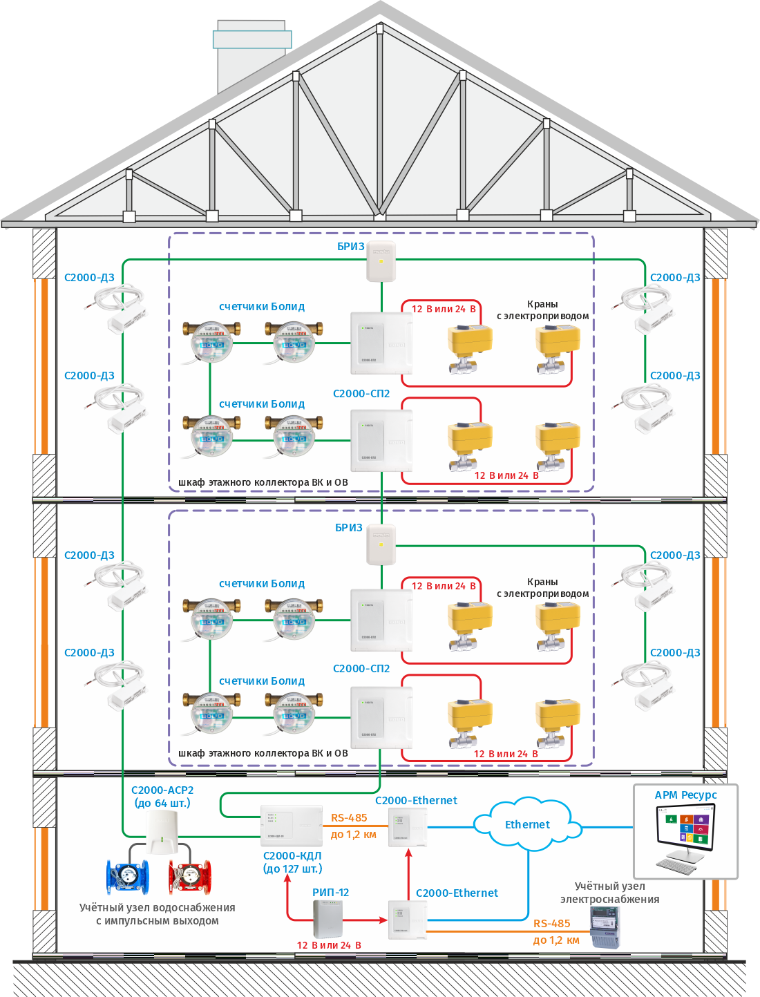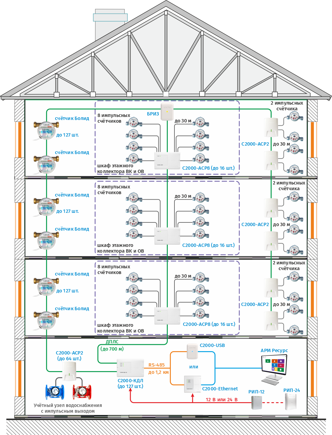Сбор показаний с импульсных счетчиков организуется с помощью проводных адресных регистраторов импульсов С2000-АСР2 и/или С2000-АСР8 и контроллера двухпроводной линии связи С2000-КДЛ. С2000-АСР2 и С2000-АСР8 подсчитывают импульсы от счетчиков и по ДПЛС передают данные о расходе на сетевые контролеры С2000-КДЛ. Последние преобразуют сигнал ДПЛС в сигналы двухпроводного магистрального интерфейса RS-485, обеспечивают адресацию счетчиков, накапливают и хранят текущие показания счетчиков и по запросу ПО АРМ "Ресурс" передают данные на ПК для обработки и отображения информации. Подключение контроллеров С2000-КДЛ к серверу с ПО АРМ «Ресурс» осуществляется через соответствующий преобразователь интерфейсов, С2000-Ethernet или С2000-USB.