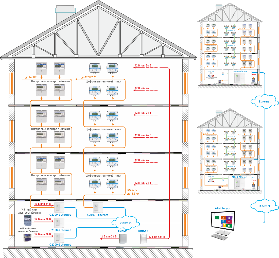 Сбор показаний с цифровых приборов учета осуществляется путем подключения счётчиков к COM-, USB-порту компьютера или по Ethernet/Internet через соответствующие преобразователи интерфейсов. Для каждой модификации счетчиков должен быть предусмотрен отдельный преобразователь интерфейсов. Питание 12 или 24в интерфейса RS-485 приборов учета может быть, как внутреннее, так и внешнее. Количество приборов учета подключенных к одной линии RS-485 – до 127 приборов. Поддерживаются любые цифровые счетчики. Интеграция в систему новых приборов производится бесплатно.