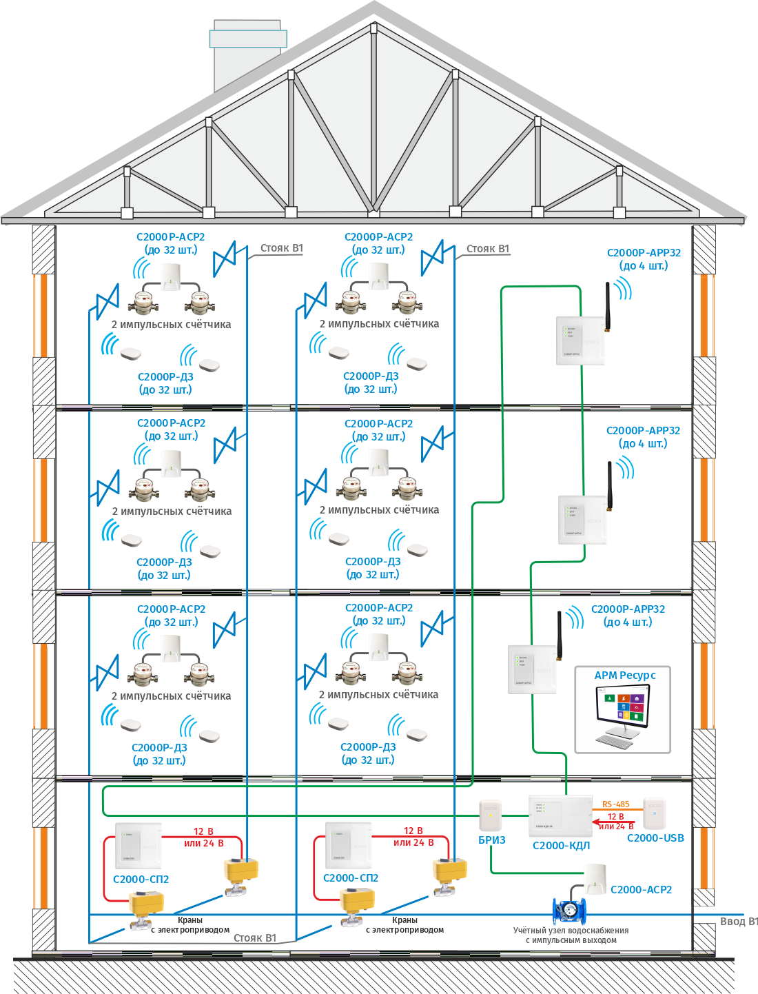 Сбор показаний с импульсных счётчиков по радиоканалу организуется с помощью беспроводных регистраторов импульсов С2000Р-АСР2, радиорасширителя С2000Р-АРР32 и контроллера С2000-КДЛ. Радиоканальные счётчики воды СВК15-3-8-1-Б3 подключаются к С2000Р-АРР32 напрямую. В условиях МКД, после тестирования качества радиосвязи возможен охват одним С2000Р-АРР32 трёх этажей в секции. Если качество радиосвязи не позволяет этого, то для обеспечения гарантировано хорошего соединения между С2000Р-АРР32 и радиоустройствами рекомендуется ставить С2000Р-АРР32 на каждый этаж секции. Схема оптимальна при невозможности завести кабель в квартиры. Функционал и соединение С2000-КДЛ с АРМ «Ресурс» аналогично проводному решению.