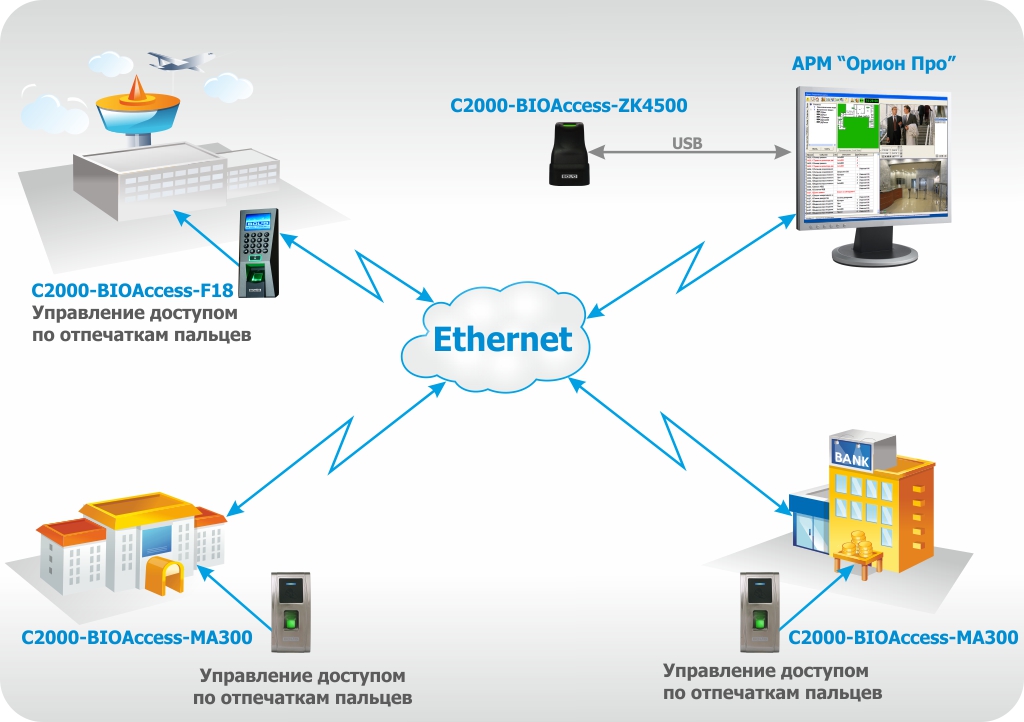 Контроллер может подключаться к ИСО «ОРИОН» по информационному интерфейсу Ethernet. Возможность подключения контроллера по сети Ethernet позволяет, при наличии «защищённой» локальной сети, без дополнительных затрат на кабельные линии связи организовать СКУД с биометрической идентификацией. Такая система может легко распределяться по зданию или комплексу зданий в соответствии с топологией локальной сети.