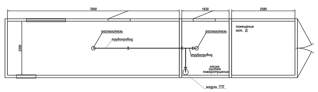 В зависимости от пожарной нагрузки, температурного режима, технологических и конструктивных особенностей, месторасположения контейнера масса ГОТВ, необходимая для создания огнетушащей концентрации внутри контейнера, может потребоваться до 54 кг хладона 125ХП. Это количество газа уберется в один 60л. модуль ГПТ (МГП (65-60-32)Э). При этом потребуется запасной модуль, согласно нормативным требованиям, размещаться который может на складе Заказчика. На рис.1 представлена примерная схема расположения оборудования и трубопроводов установки газового пожаротушения.