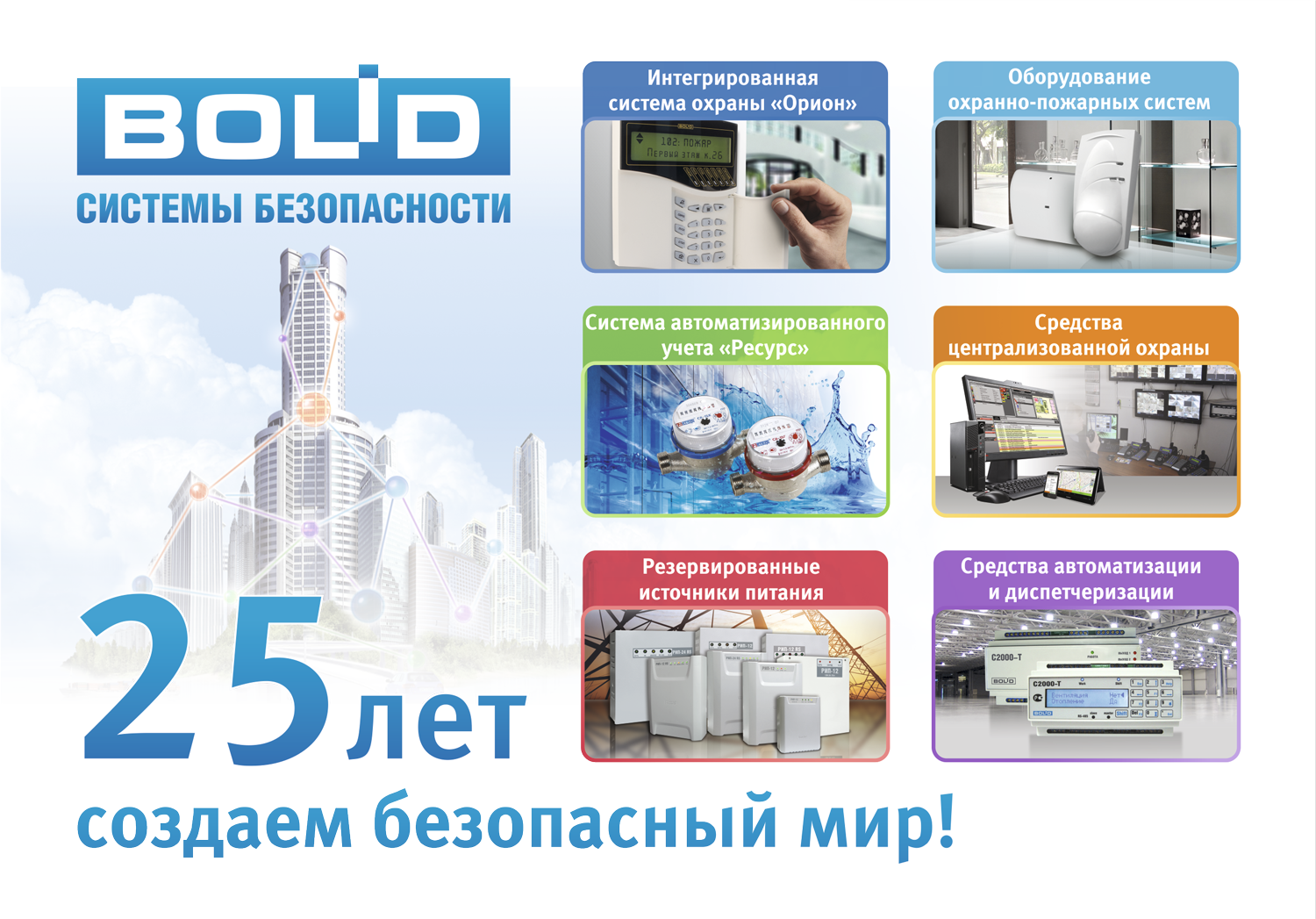 В 2016 г. компания "Болид" празднует свой 25-й День рождения. За четверть века наша компания выросла в одну из мощных, технически оснащенных и стала лидером на рынке разработки и производства систем ОПС, пожарной автоматики, СКУД и интегрированных решений безопасности.