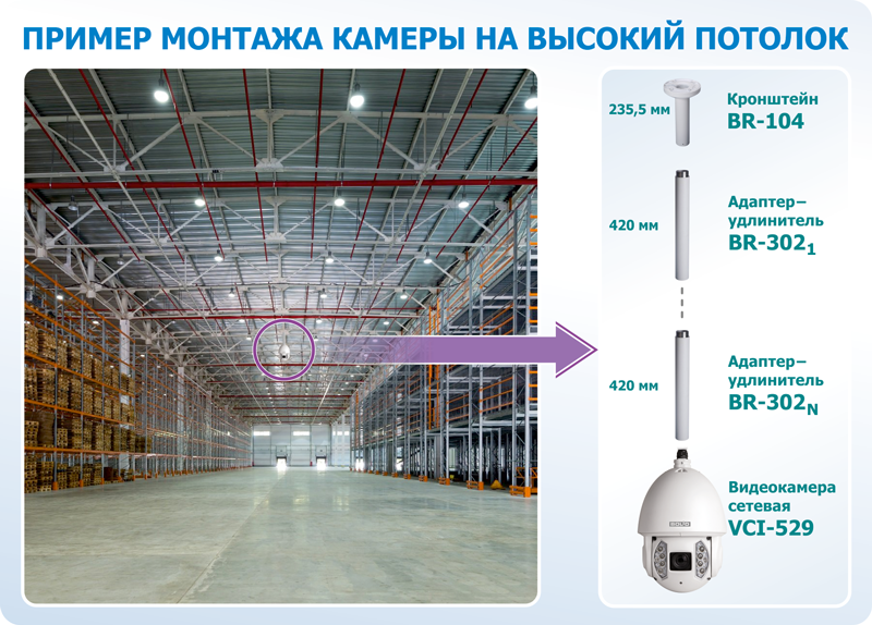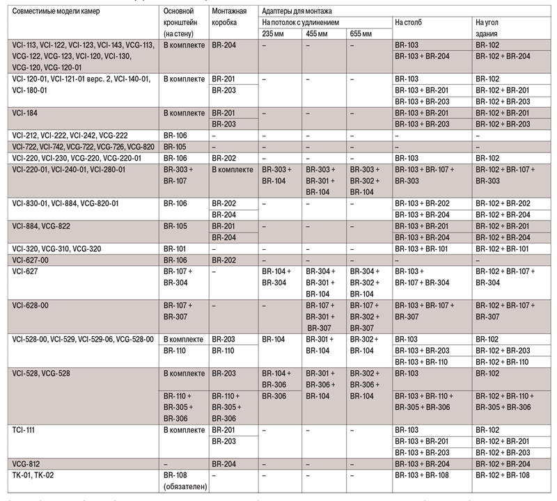 Например, высокоскоростная камера VCI-528 имеет настенный кронштейн в комплекте поставки, однако у встроенного кронштейна относительно небольшой “вылет” от стены. Поэтому там, где это важно можно использовать более длинный кронштейн BR-110. Прямой совместимости VCI-528 и BR-110 нет, однако камеру можно установить на кронштейн через монтажные адаптеры BR-305 и BR-306.
