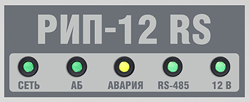 Например, если напряжение сети отсутствует, а напряжение на батарее более 11В (в источниках питания с выходным напряжением 12В), индикация РИП будет выглядеть следующим образом: индикаторы "АКБ", "12В" включены, индикатор "RS-485" включен при наличии связи по интерфейсу RS-485. При этом звуковой сигнализатор будет кратковременно включаться с периодом 5 с. При плохом состоянии батареи (большое внутреннее сопротивление) индикаторы "АКБ" и "Авария" будут мигать с частотой 1 Гц, звуковой сигнализатор кратковременно включится 5 раз, а индикаторы "Сеть", "12В", "RS-485" будут работать в стандартном режиме.