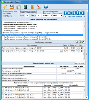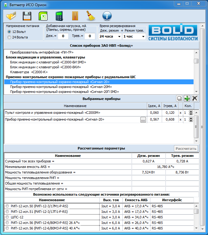 Время наработки и температуру эксплуатации аккумулятора также можно учесть и при подборе источника питания в системах ОПС. Для этого существует специальная программа "Ваттметр ИСО "Орион", разработанная специально для подбора РИП. Данная программа позволяет произвести расчет параметров системы безопасности: ток потребления от источника питания, мощность потребления от сети, мощность тепловыделения. Самое главное – программа оптимизирует выбор резервированного источника питания системы, исходя из заданного напряжения, тока нагрузки и необходимого времени резервирования. Очень часто встречаются случаи, когда в проект объекта закладываются более мощные источники питания, которые также и более дорогостоящие, чем это нужно на самом деле. Оптимизированный подбор источников питания программой "Ваттметр ИСО "Орион" решает эту проблему. Программа ориентирована на расчет параметров систем, построенных на оборудовании ЗАО НВП "Болид", при этом есть возможность добавлять в расчет и другие приборы. Используя при расчете проектов системы ОПС утилиту "Ваттметр ИСО "Орион", можно точно подсчитать, какой запас емкости необходим оборудованию для работы в резервном режиме.