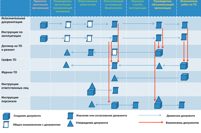 Проследить значимость руководства по эксплуатации для формирования остальных документов и приобретения компетенций различными категориями сотрудников на объекте можно по следующему табличному графику (рис.1), отражающему типовой процесс формирования и использования эксплуатационной документации.