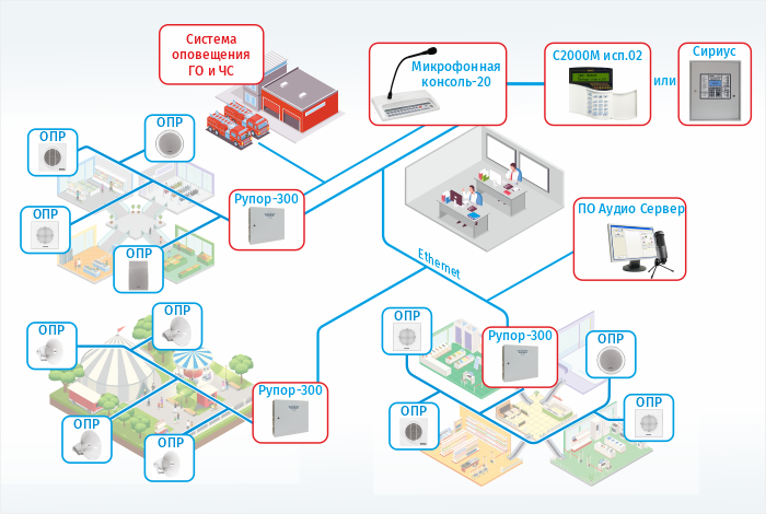 В рамках одной системы оповещения одновременно могут использоваться несколько консолей с различными приоритетами для организации пожарных постов,  рабочих мест секретарей, стоек информации (рис.2).  Передача информации от консоли к «Рупор-300» осуществляется по сети Ethernet. Один блок «Рупор-300» может быть включен в несколько зон. В одну зону может быть добавлено до 100 блоков «Рупор-300», а во всех зонах одной консоли может быть до 500 блоков.