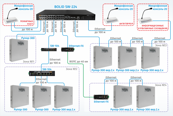Блоки «Рупор-300» подключаются к тому же коммутатору уже одной линией. Такой вариант подключения допустим, так как  при нарушении линии теряется ручное управление не более чем одной зоной оповещения. Если консоль и блоки речевого оповещения находятся в непосредственной близости друг от друга на расстоянии до 100 м от коммутатора, то для построения сети можно ограничиться этим коммутатором. Если же система распределенная, то в нее добавляются новые коммутаторы или медиаконвертеры для передачи сигналов по ВОЛС.