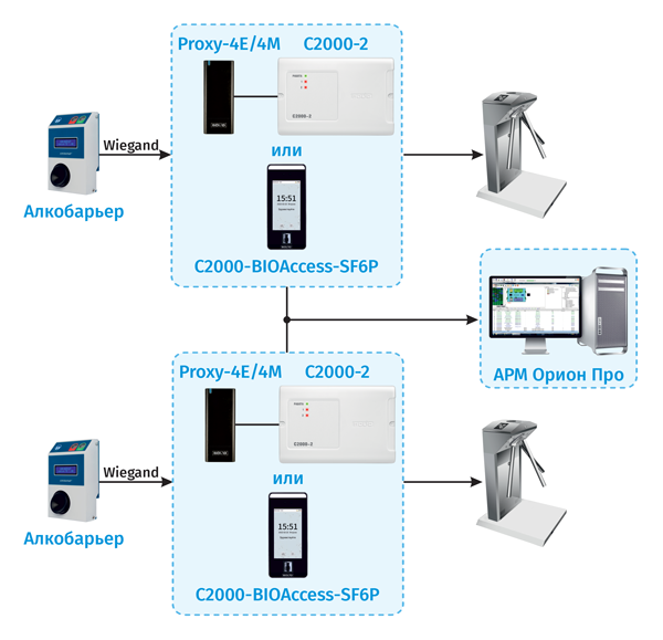 В отличие от локальной точки контроля и доступа, сетевые решения предполагают использование программного обеспечения АРМ «Орион Про», которое позволяет не только в удобной форме администрировать базу сотрудников, но и просматривать журнал событий по всем точкам доступа, формировать разнообразные отчеты. Кроме этого, наличие рабочих мест с различным функционалом обеспечивает возможность внедрения процедуры массового алкотестирования на предприятии. Структурная схема проходной с алкотестерами изображена на рис.2.