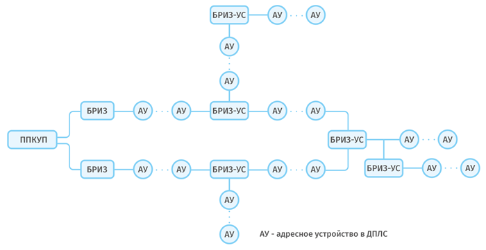 Новинкой 2025 года в ряду ИКЗ станет устройство «БРИЗ-УС», которое наряду с функцией защиты от короткого замыкания позволяет увеличить на нескольких километров длину ДПЛС и увеличить количество токопотребляющих адресных устройств. При этом «БРИЗ-УС» позволяет реализовать достаточно сложную топологию ДПЛС (Рис.3).